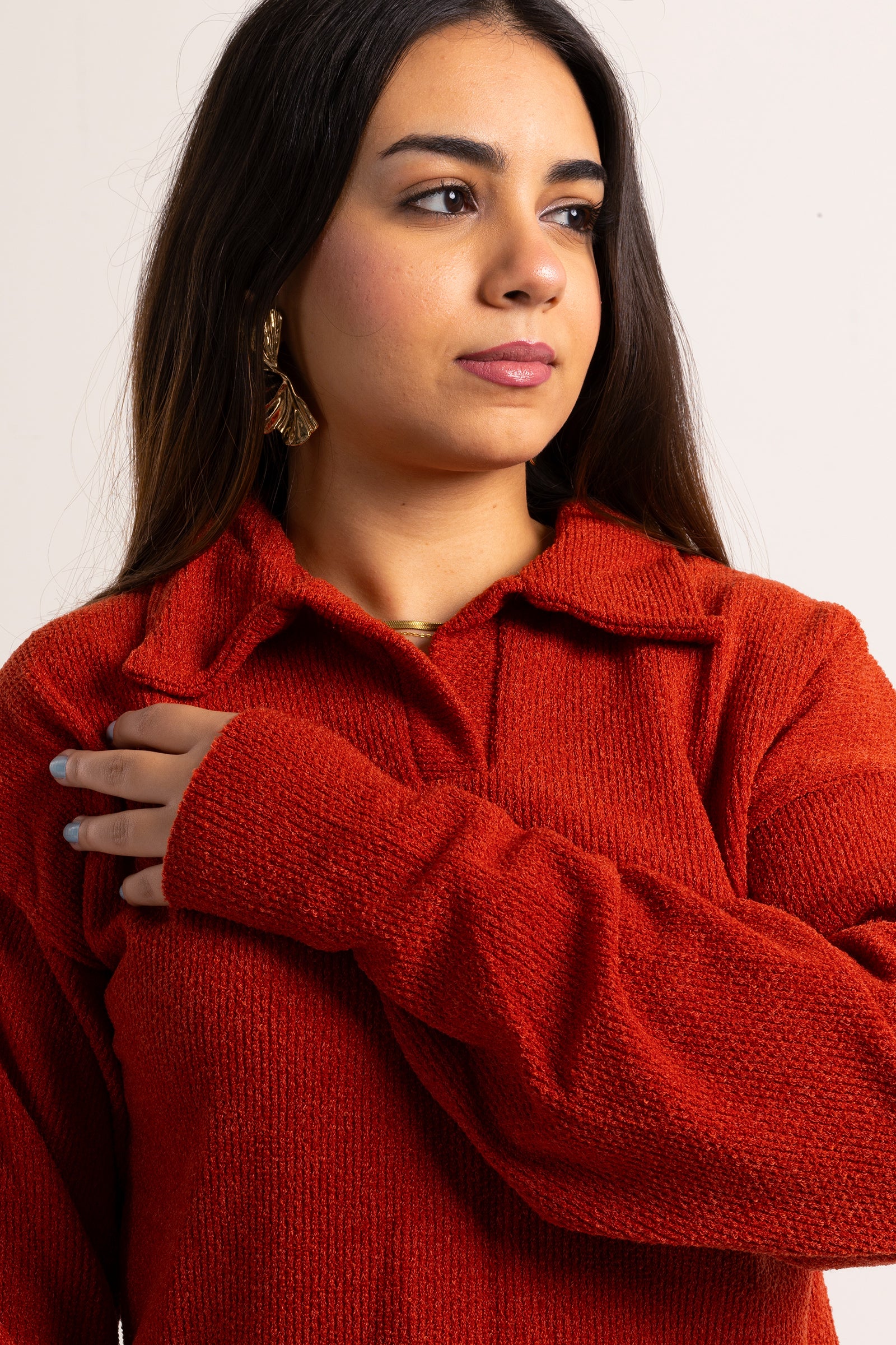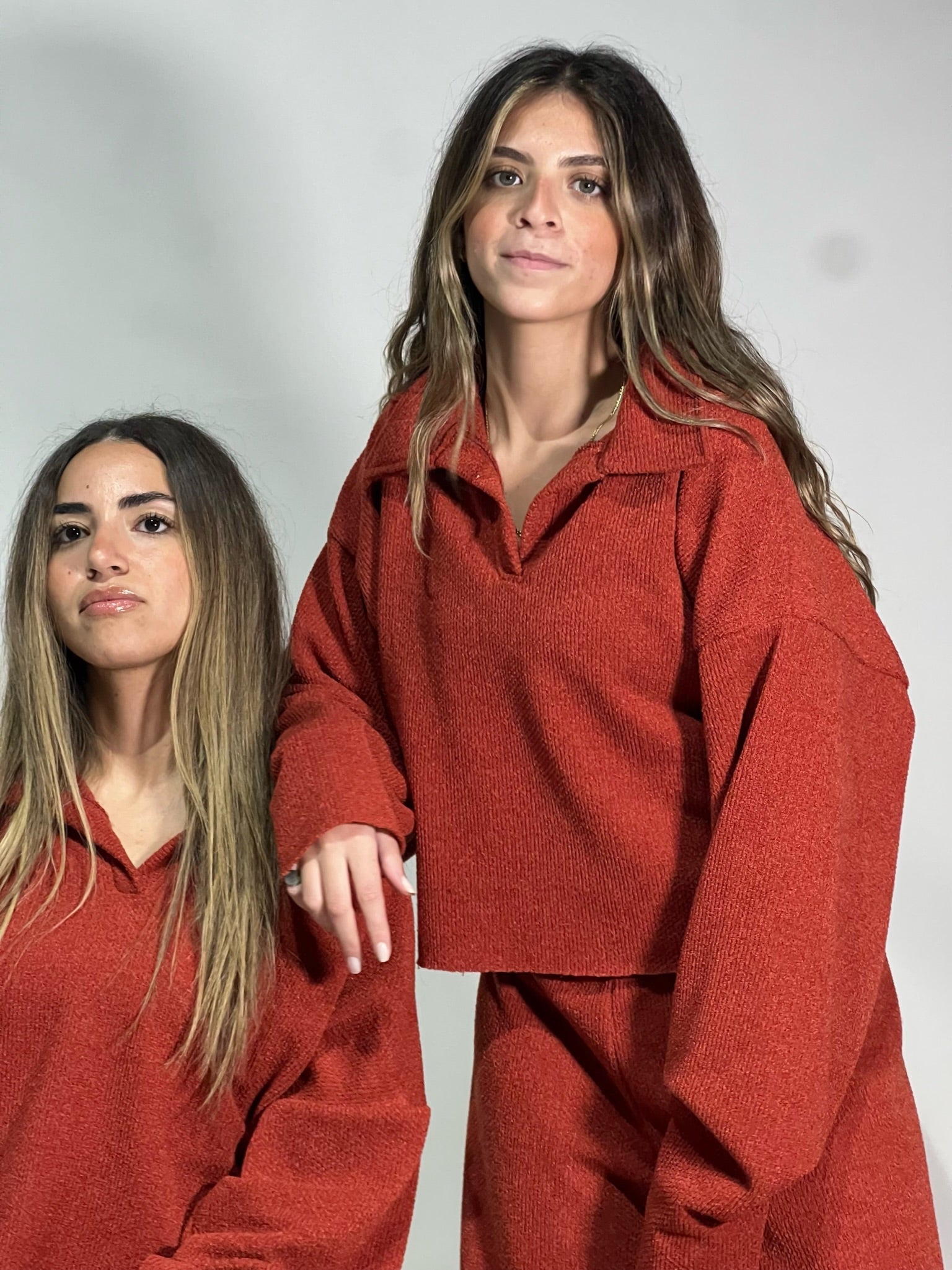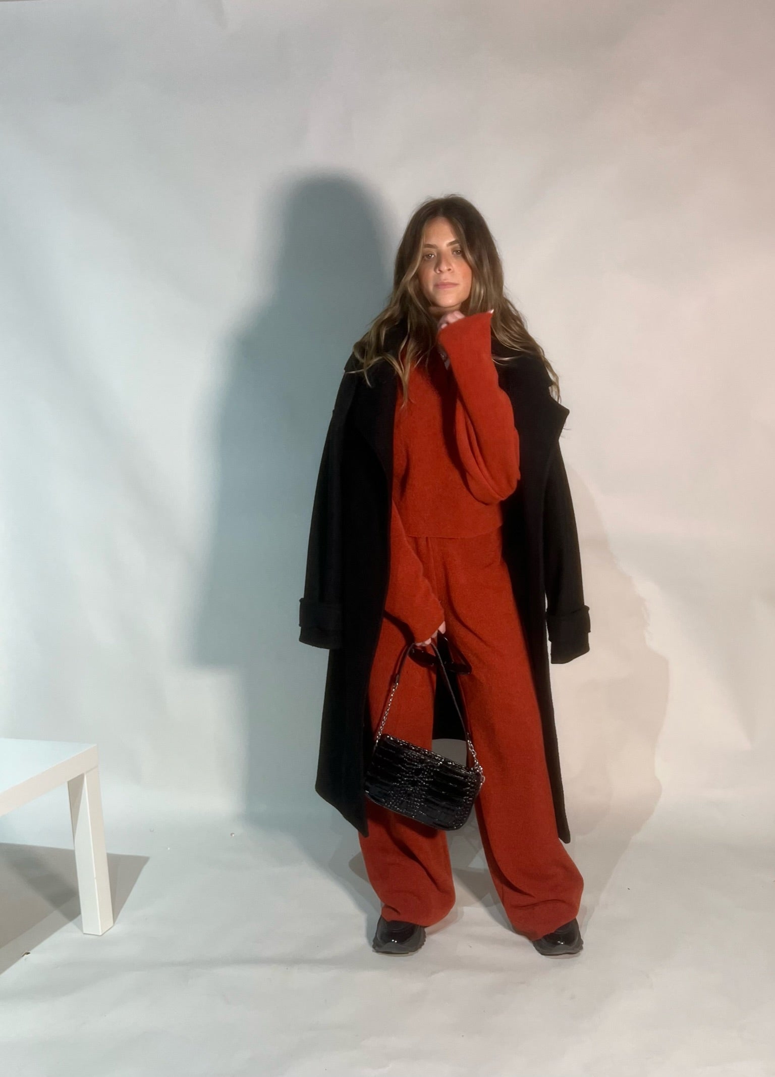 Effortlessly stylish and cozy, this knitted set features a polo-style shirt with an oversized fit and a flattering V-neckline. Paired with wide-leg pants and an elastic waistband for ultimate comfort. Available in classic black and warm brick—perfect for a chic, relaxed look. Layer it with our Black Wool Coat for an elevated, cozy ensemble.